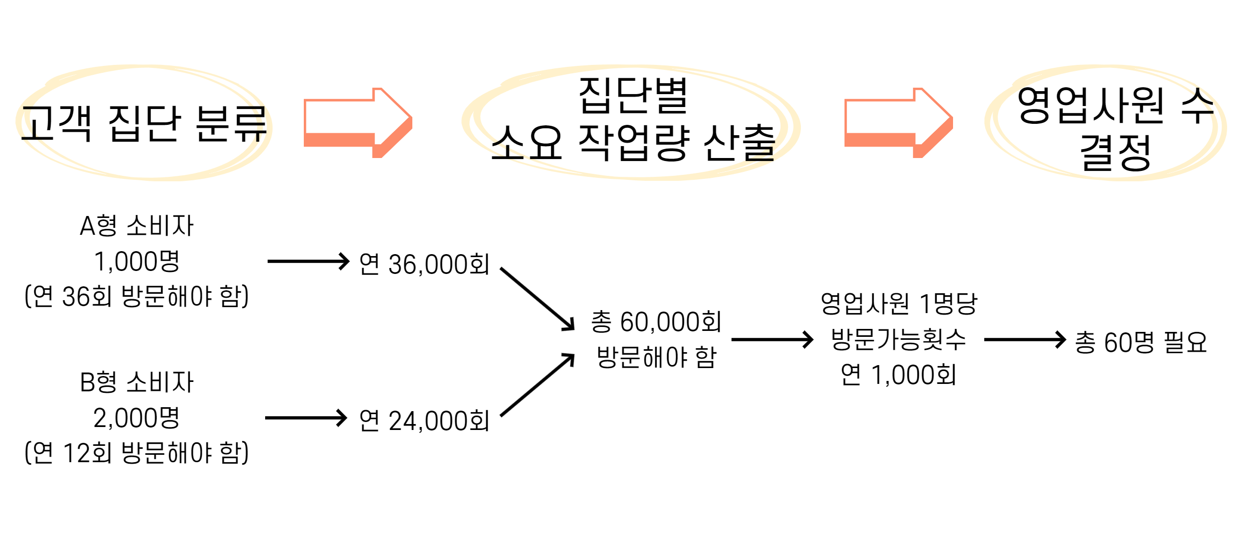 위 그림을 설명드리겠습니다. 우선 고객 집단을 분류해야 합니다. 고객 특성에 따라 A형과 B형으로 고객 집단을 분류했다고 가정하겠습니다. A형 소비자는 1,000명이며 각 소비자별로 연 36회 방문을 해야 합니다. B형 소비자는 2,000명으로 연 12회 방문을 해야 합니다. 계산을 해보면 이번 년에 총 60,000회 방문을 해야 합니다. 여기서 영업사원 1명당 방문가능횟수는 연 1,000회라고 가정하겠습니다. 결과적으로 총 60명의 영업사원이 필요합니다.