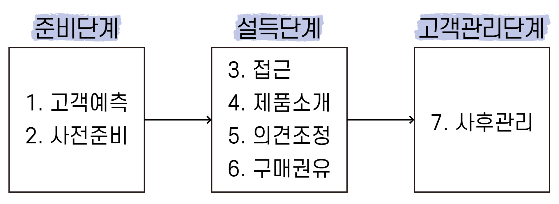 인적판매 과정은 밑에 그림과 같이 크게 준비, 설득, 고객관리 단계로 나뉩니다. 준비단계는 여러 분석을 통해 잠재고객을 찾아내고 이들에게 접근하는 방법을 찾는 단계입니다. 설득단계는 잠재고객에게 접근하여 최종적으로 구매권유를 하는 단계입니다. 마지막으로 고객관리단계는 반복구매와 긍정적인 구전을 이끌어내기 위해 지속적으로 고객을 관리하는 단계입니다. 각 단계별로 자세히 알아보도록 하겠습니다.