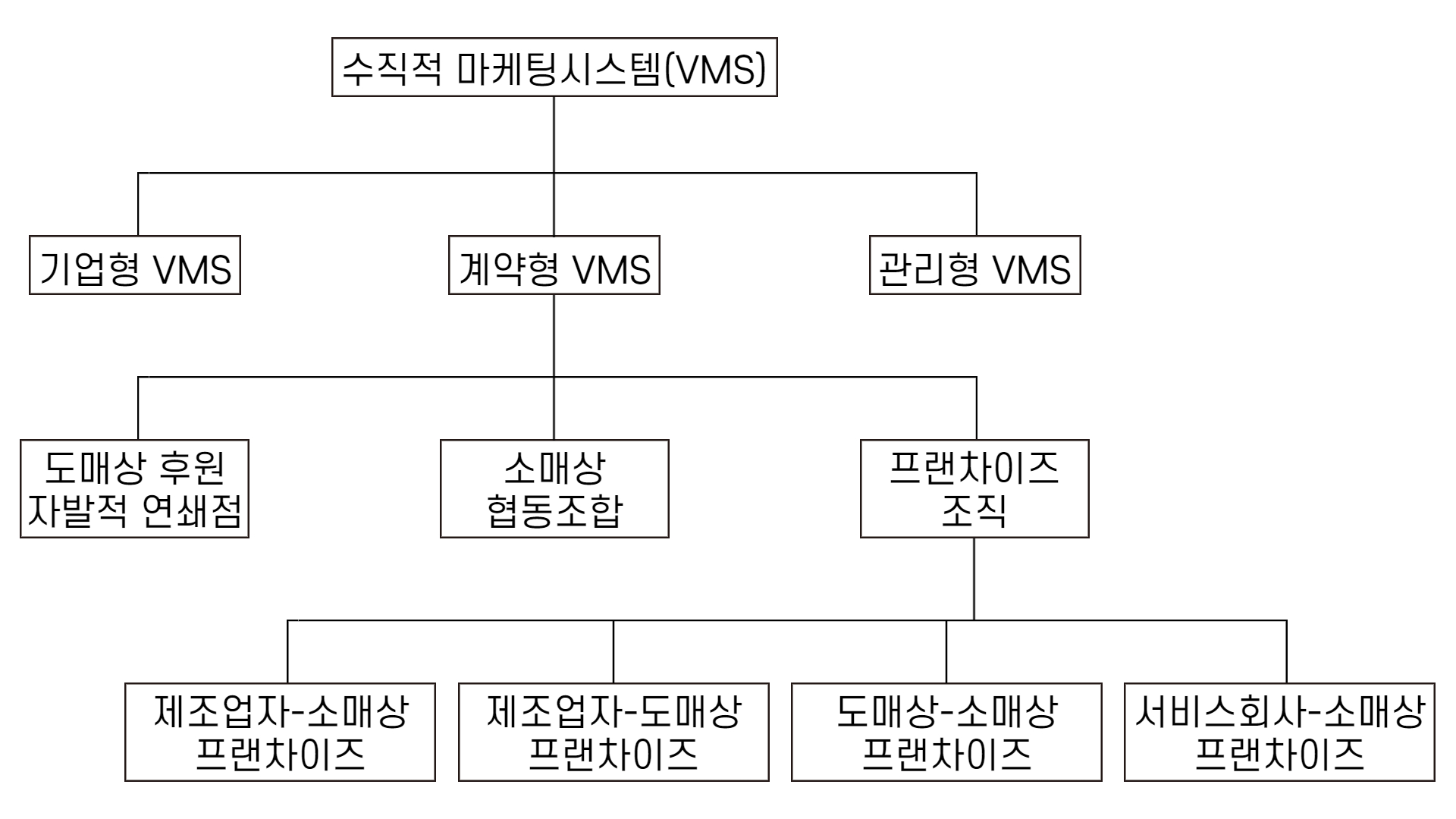 수직적 마케팅시스템(Vertical Marketing System: VMS)이란 운영상의 경제성과 시장에 대한 영향력을 얻기 위해 제품이 생산업체부터 소비자까지 흐르는 수직적 유통단계를 전문적으로 관리하는 것을 뜻합니다. 수직적 마케팅시스템은 경로구성원에 대한 통제력이 증가한다는 장점이 있지만, 초기 유통망 설계 시 막대한 자본이 소요되고 유통환경변화에 유연한 대응이 어렵다는 단점도 존재합니다. 밑에 그림을 보시면 수직적 마케팅시스템은 크게 기업형VMS, 계약형VMS, 관리형VMS로 분류할 수 있습니다.