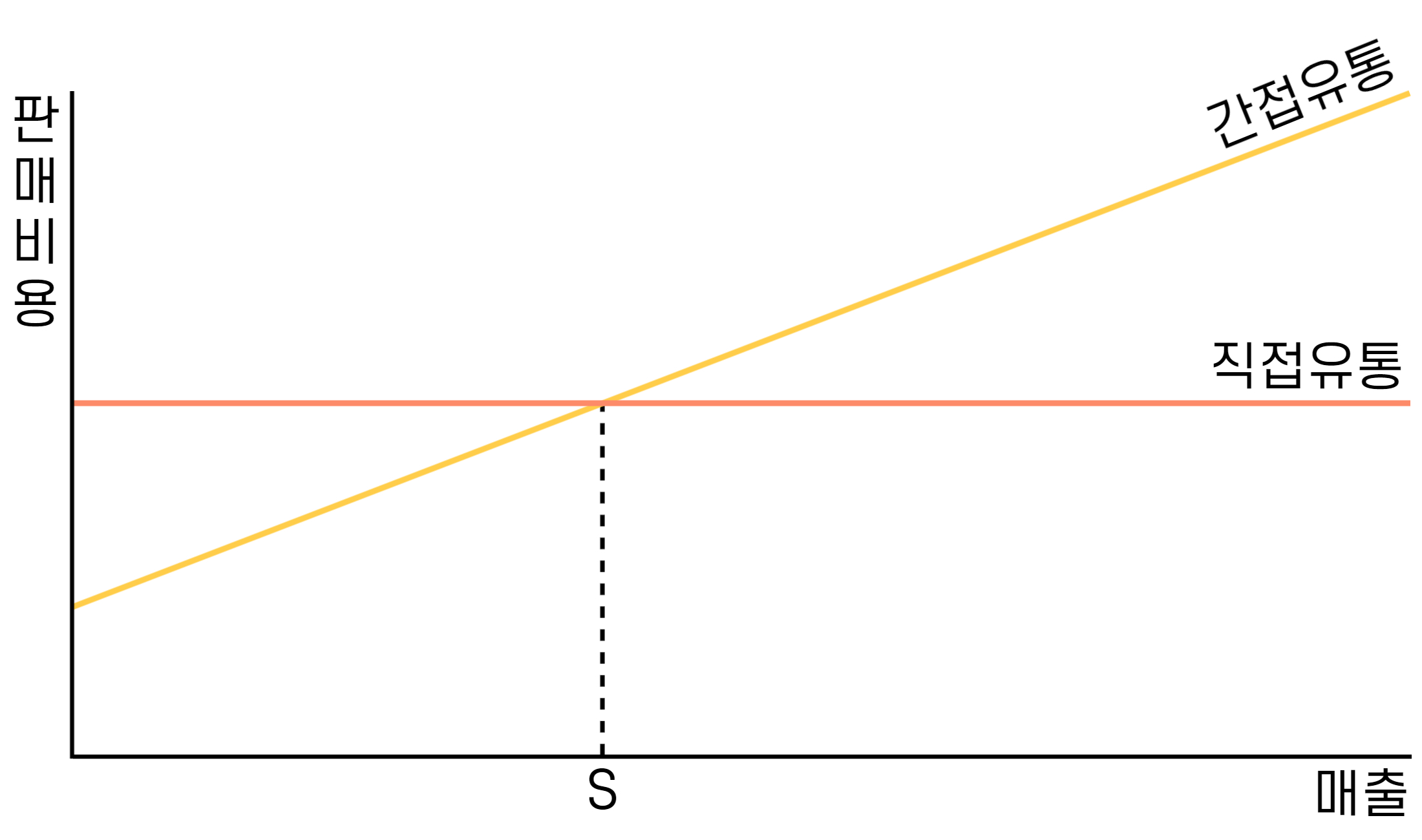 일반적으로 간접유통은 직접유통보다 고정비가 낮습니다. 하지만 간접유통은 매출이 증가할수록 중간상에게 많은 커미션을 제공하기 때문에 판매비용이 빠르게 증가합니다. 밑에 그림에서 보이는 S는 간접유통과 직접유통의 판매비용이 같아지는 매출수준입니다. 따라서 매출이 S 이하일 경우에는 간접유통이 바람직하고, S 이상일 경우에는 직접유통이 바람직합니다.