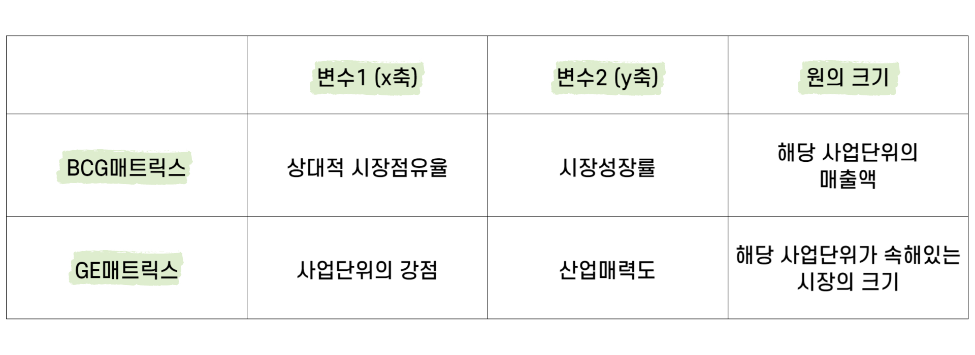 안녕하세요. 공대형아J입니다. 오늘은 BCG 매트릭스와 GE매트릭스에 대해 알아보도록 하겠습니다. 각 매트릭스는 두 개의 변수를 기준으로 xy축을 구분하고 각 변수 측정치의 높고 낮은 정도에 따라 SBU들의 매력도를 측정할 수 있게 설계되었습니다. 각 SBU들은 좌표 내에 원의 형태로 위치하게 됩니다.