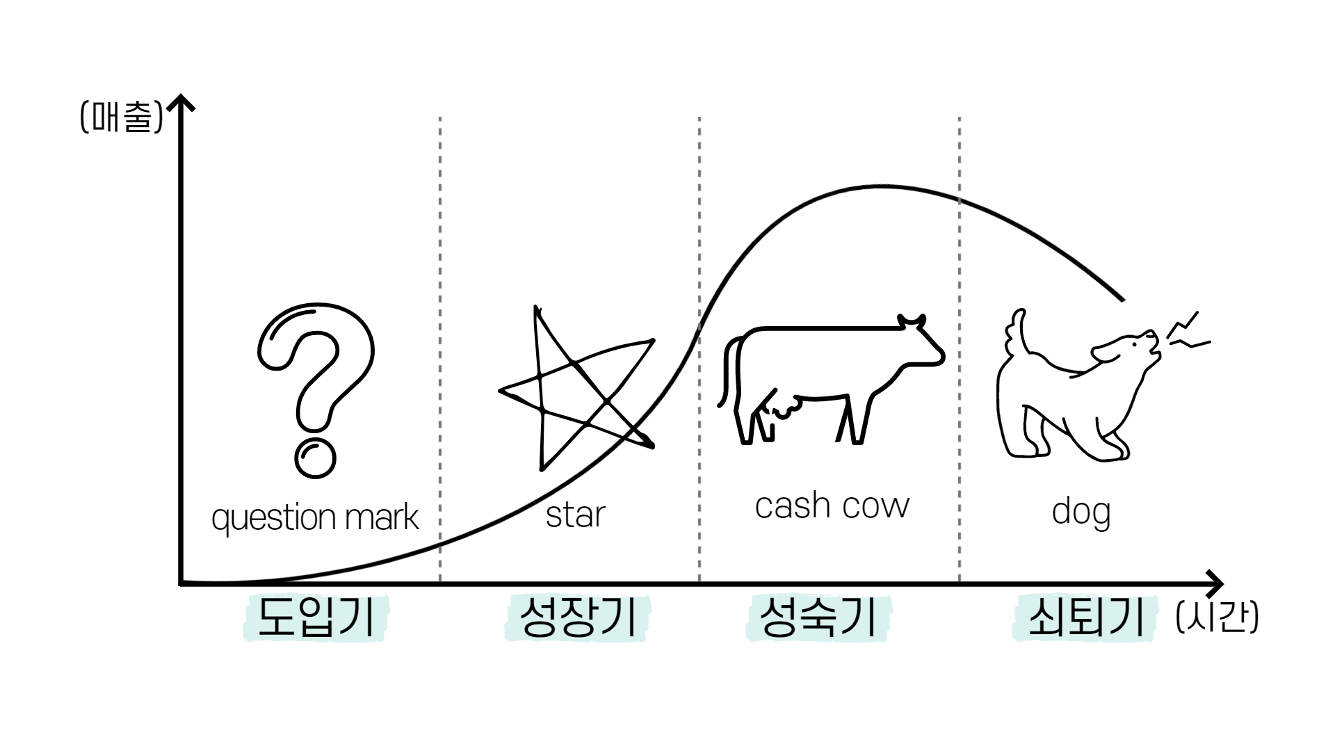 BCG 매트릭스는 제품수명주기(Product life cycle: PLC)와 연결시켜 전략을 수립할 수도 있습니다. PLC에 대해서는 추후에 4P 중 제품을 다룰 때 다시 한번 설명하도록 하겠습니다.