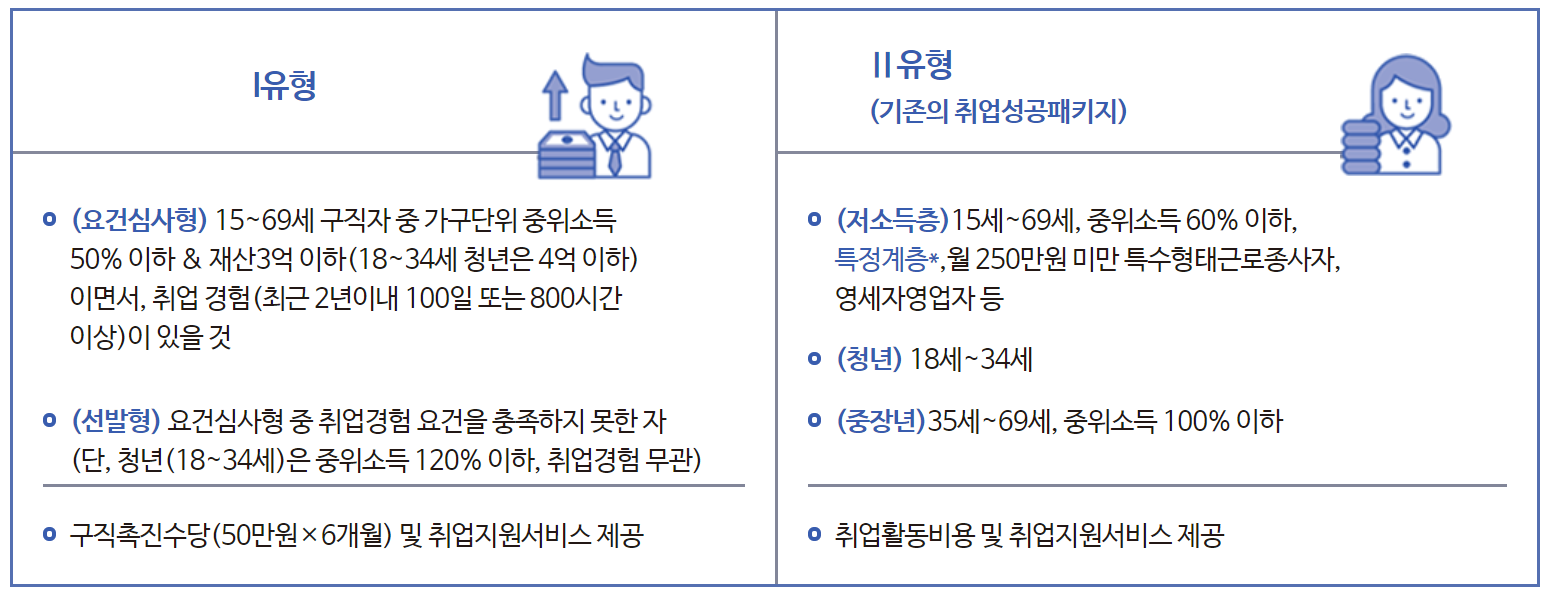 일단 국취제(국민취업지원제도)는 1유형과 2유형으로 나누어져 있습니다. 1유형의 경우 위에서 말씀드린 것처럼 매달 50만 원씩 총 300만 원을 지원받게 됩니다. 2유형은 매달 50만 원은 지원받지 않지만, 취업활동비용과 취업지원서비스를 받을 수 있습니다. 가능하면 1유형에 선발되어 매달 50만 원씩 지원받으면 좋겠죠? 각 유형별 조건은 다음과 같습니다.