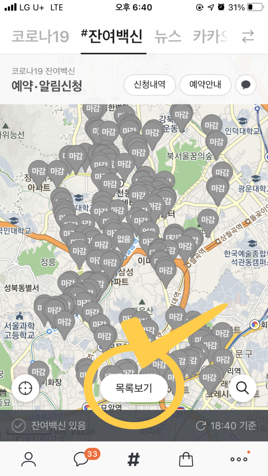 카카오톡에서 잔여백신 탭에 들어가시면 이런 지도가 나옵니다. 일단 "잔여백신 있음" 체크를 풀어줍니다. 그러면 밑에 사진처럼 전부 마감이라고 뜨고 많은 병원이 나옵니다. 이때 지도를 조정하여 최대한 많은 병원이 지도에 나오되, 본인이 실제로 빠른 시간 내에 갈 수 있는 거리까지만 지도에 나오게 조정합니다. 만약 너무 먼 곳의 병원으로 잔여백신 예약을 해버리면 가기가 쉽지 않으니까요(저의 경우 예약하자마자 1시간 이내에 오라고 했었어요).