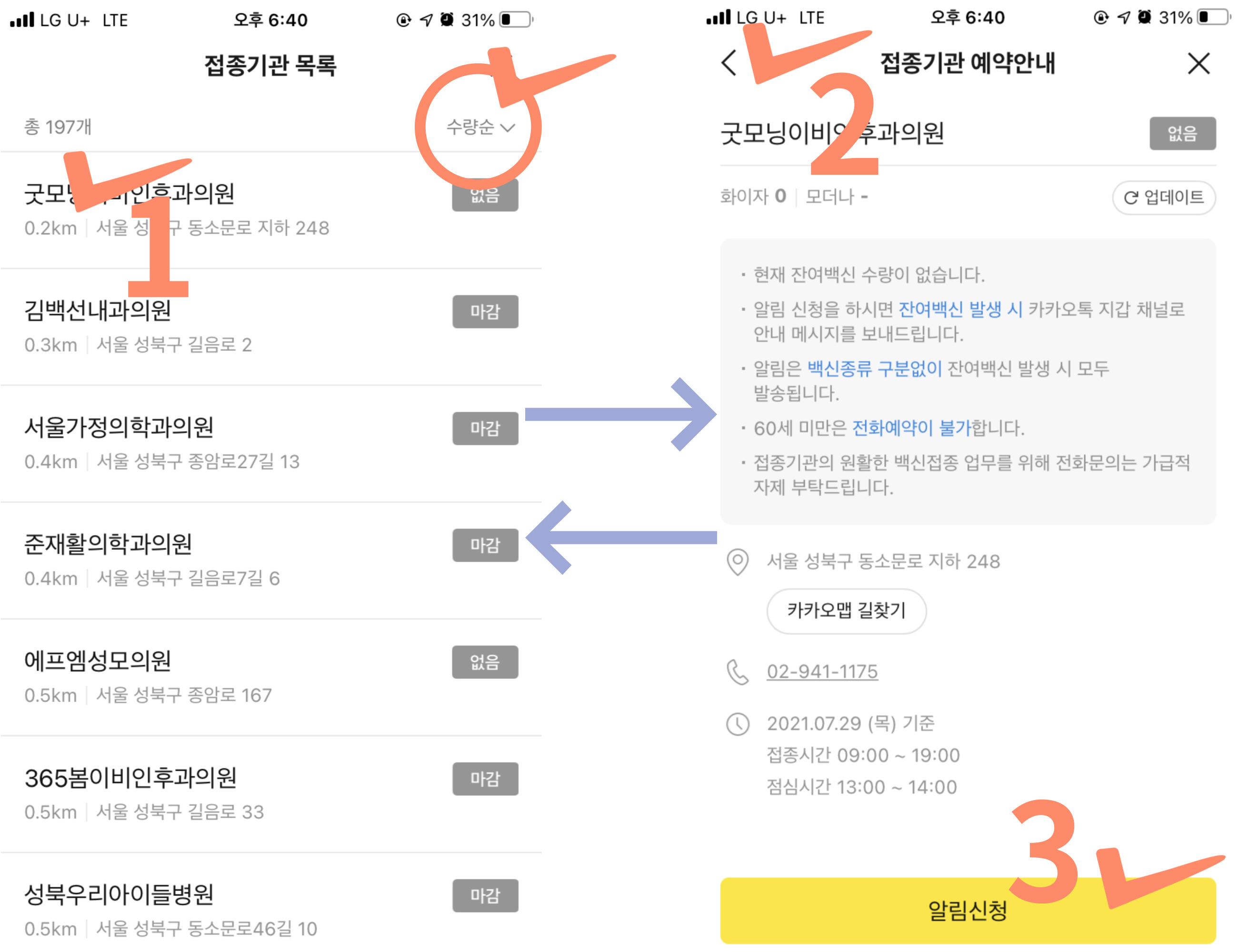 지도를 조정한 후 밑에 "목록보기"를 눌러줍니다. 목록보기를 누르면 왼쪽 사진과 같이 병원 목록이 쭈욱 뜹니다. 일단 동그라미에 보이는 것과 같이 "수량순"으로 지정해둡니다. 수량 순으로 하면 새로고침을 할 때마다 잔여백신이 하나라도 뜨면 해당 병원이 맨 위에 보이기 때문에 광클 하기 쉽습니다. 수량 순으로 세팅을 완료하셨다면 이제 목록 맨 위의 병원을 클릭합니다(1번 클릭). 클릭을 하면 오른쪽 사진 같이 해당 병원으로 들어가집니다. 그러면 뒤로 가기(2번)를 클릭하시면 새로고침이 됩니다. 이제는 백신이 나올 때까지 1번, 2번을 계속 반복하며 클릭하면 됩니다.