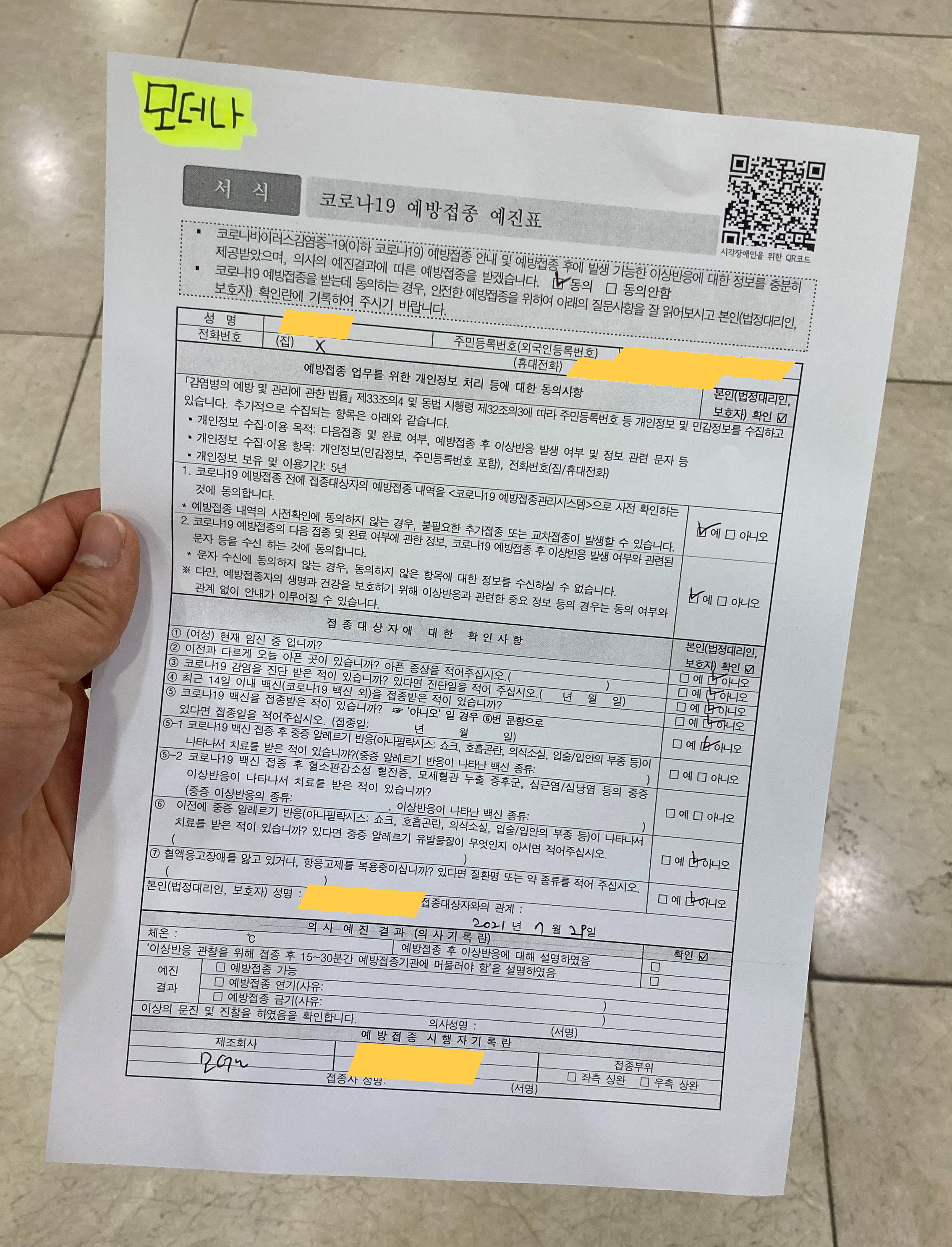 병원에 도착하니 문진표를 주시더라고요. 인적사항을 적고, 예전에 백신 맞은 적이 있는지, 이상반응이 나타난 적이 있는지 등등 간단한 질문에 체크를 했습니다.