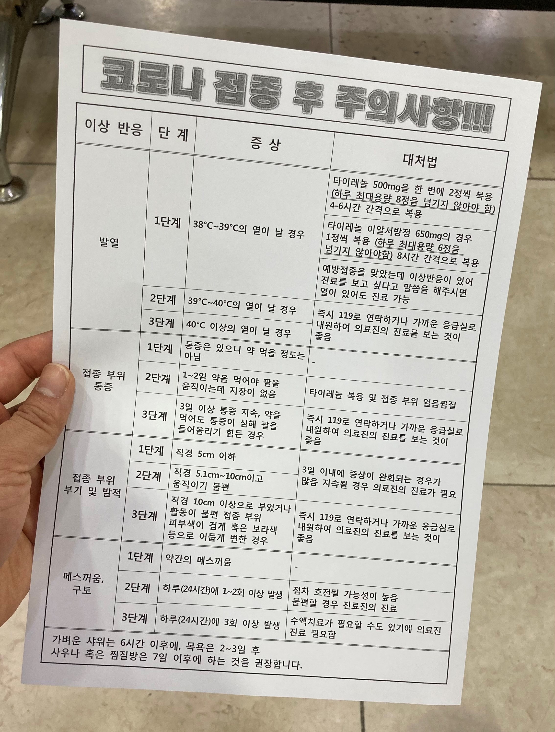 주사를 다 맞으니 간호사 선생님께서 주의사항 종이를 주셨습니다. 그리고 혹시나 이상반응이 있을 수 있으니 15분 동안 앉아있다가 가라고 하셨습니다. 다행히 저는 아무 이상이 없었습니다. 역시 건강💪💪
