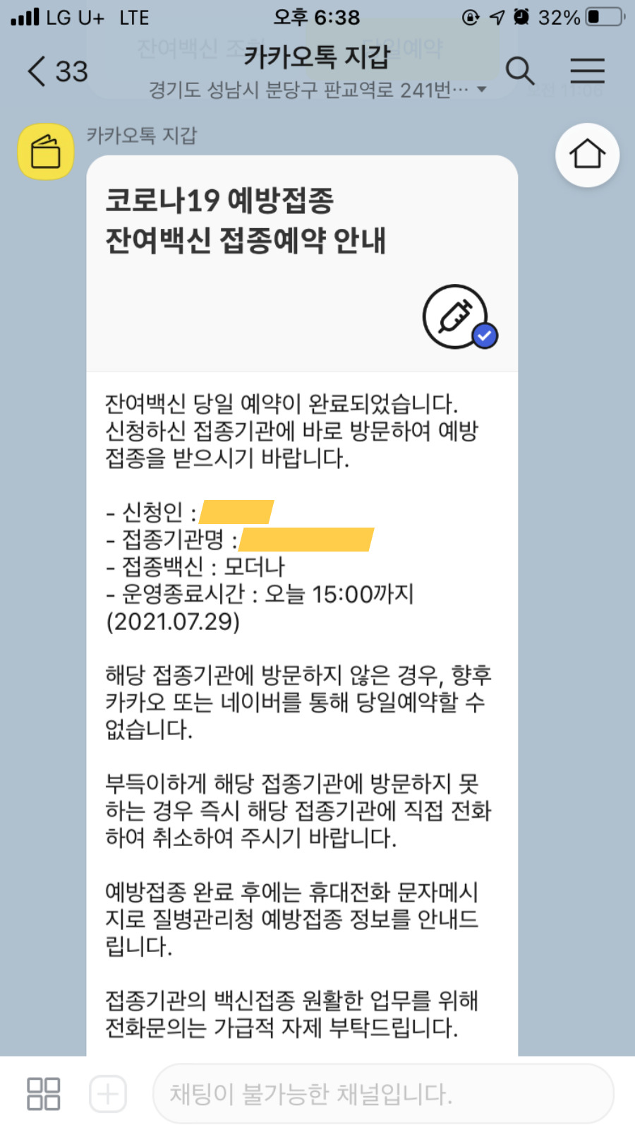 카카오톡에서 잔여백신 예약에 성공하면 이렇게 카톡이 옵니다. 저는 12시 47분에 성공을 했는데요. 카톡을 확인하니 15시까지 방문을 해야 한다고 적어져 있더라고요. 그런데 곧바로 병원에서 전화가 왔습니다. 14시까지 방문 가능하냐고 물어보더라고요(가능하냐고 물어는 봤지만 최대한 빨리 오라는 뉘향스였습니다ㅠㅠ). 그래서 점심을 먹던 와중에 뛰어갔답니다. 이렇게 예약을 하자마자 최대한 빨리 오라고 할 수도 있으니, 잔여백신을 노리신다면 너무 먼 병원이 아닌 가까운 병원으로 하는 것도 하나의 팁이 될 수 있겠습니다.