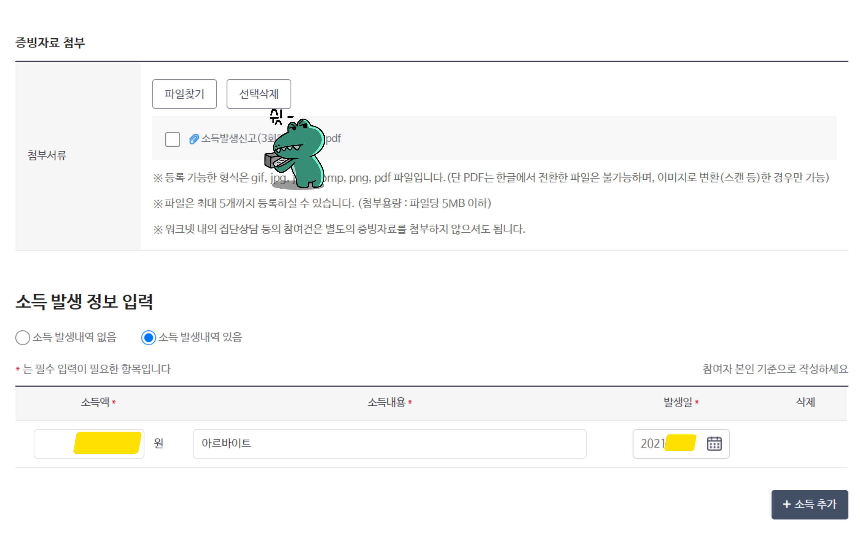 마지막으로 소득에 대해 적을 차례입니다. 소득이 적더라도 무조건 기입을 하셔야 합니다. 소득액을 기입하시고 소득 내용, 소득발생일을 선택해주세요. 이때 소득이 들어온 계좌이체내역도 은행 홈페이지 가셔서 pdf로 출력하시고 캡처하여 첨부해야 합니다.