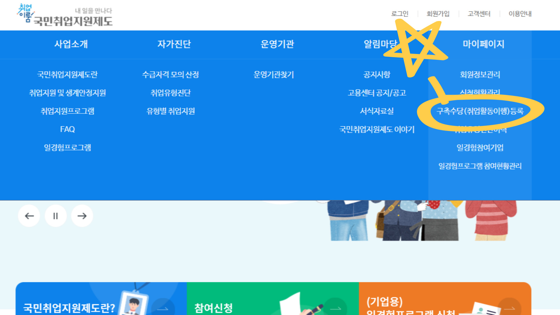 우선 로그인을 합니다. 그리고 '마이페이지>구촉수당(취업활동이행)등록'을 클릭해줍니다.