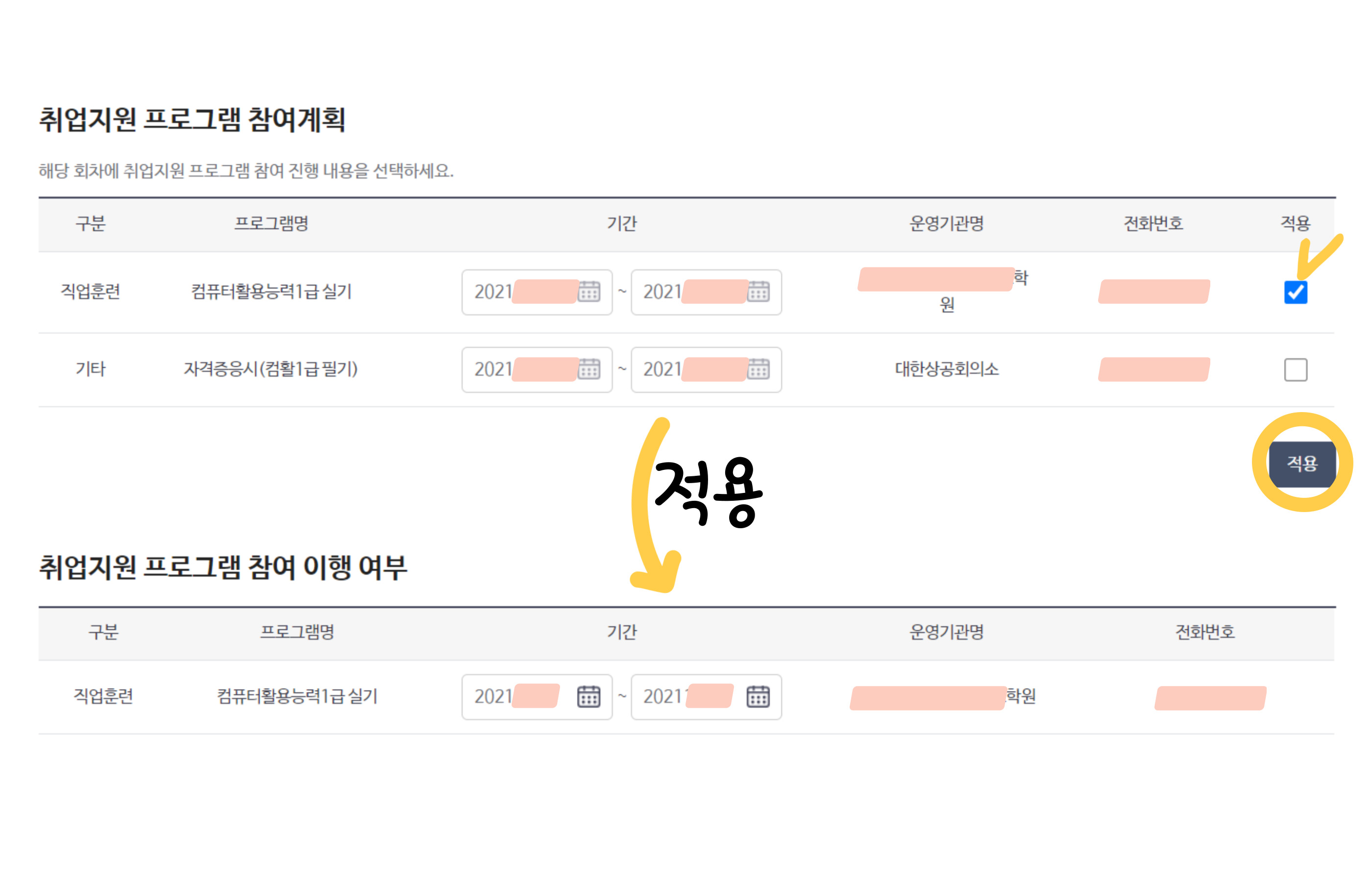 폼을 밑으로 내리시면 기존에 상담사님과 수립해 놓은 IAP의 계획이 목록에 나옵니다. 저는 내일배움카드를 이용하여 컴활 1급 직업훈련을 받는다고 계획을 수립했고, 컴활 자격증 시험도 IAP로 설정해두었습니다. 따라서 아래 사진처럼 해당 목록이 나옵니다. 여기서 본인 회차에 해당하는 활동을 체크하고 적용하시면 밑에 칸으로 딱 이동합니다. 그러면 적용이 완료된 겁니다.